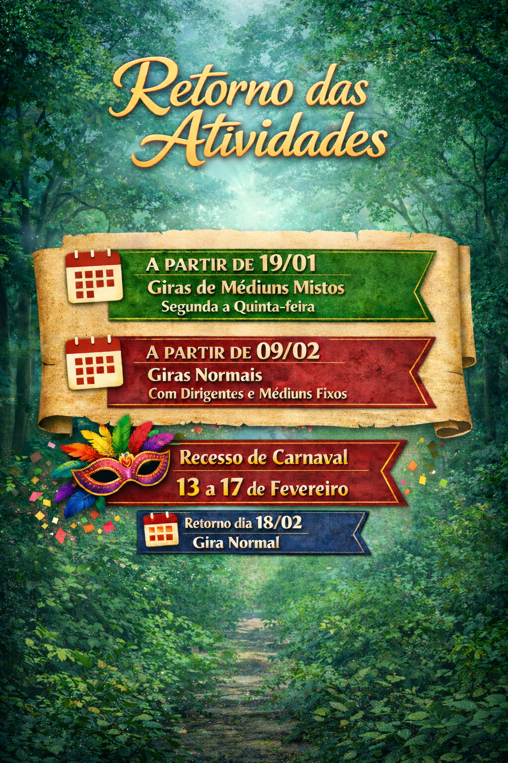 - A partir de 09/02: retorno das giras normais, com dirigentes e médiuns fixos, conforme o calendário regular da casa.